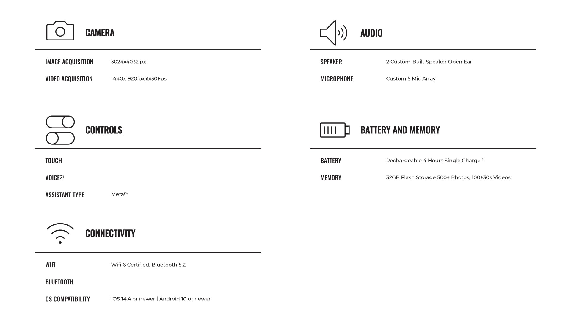 - CAPTURE WHAT YOU SEE — Take photos and record HD videos straight from your glasses with an ultra-wide 12 MP camera and five-mic system